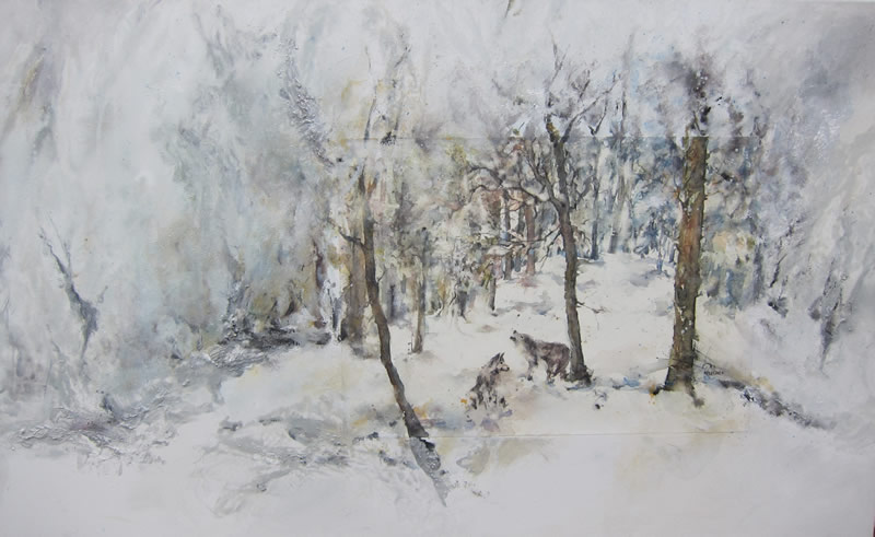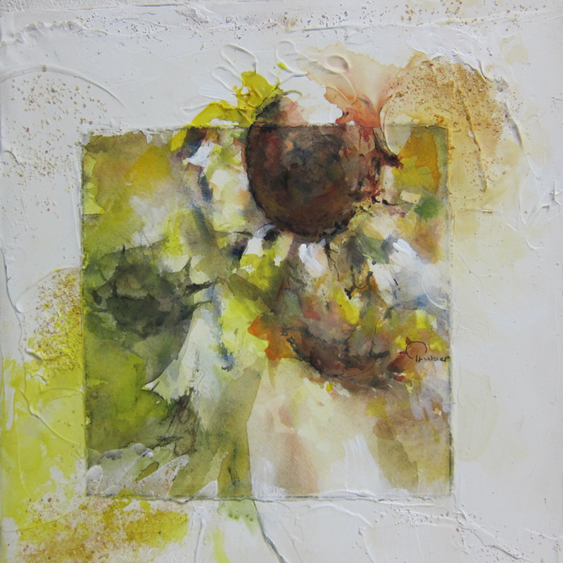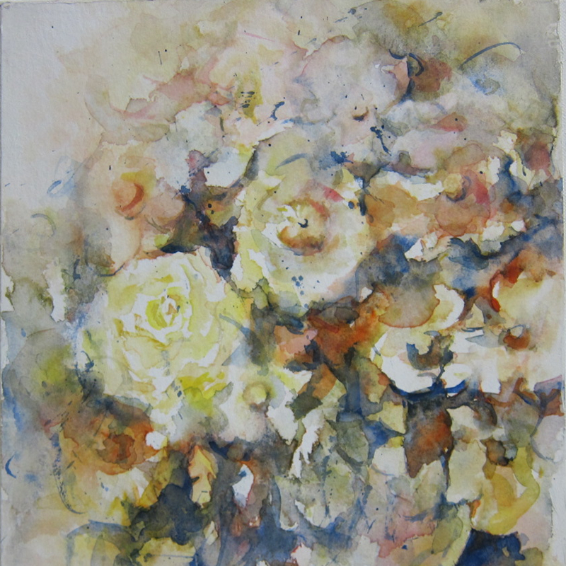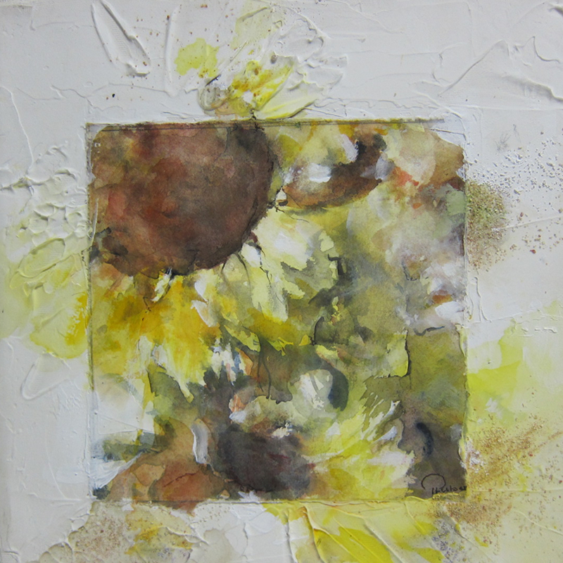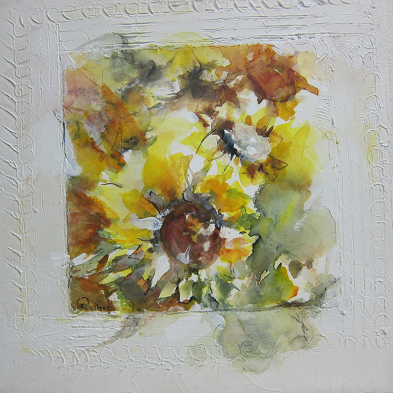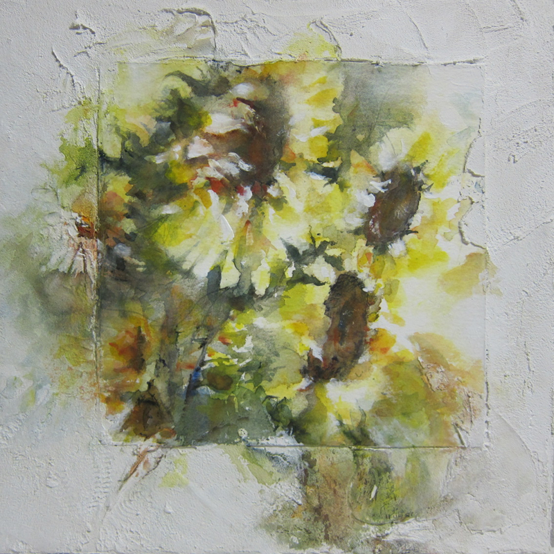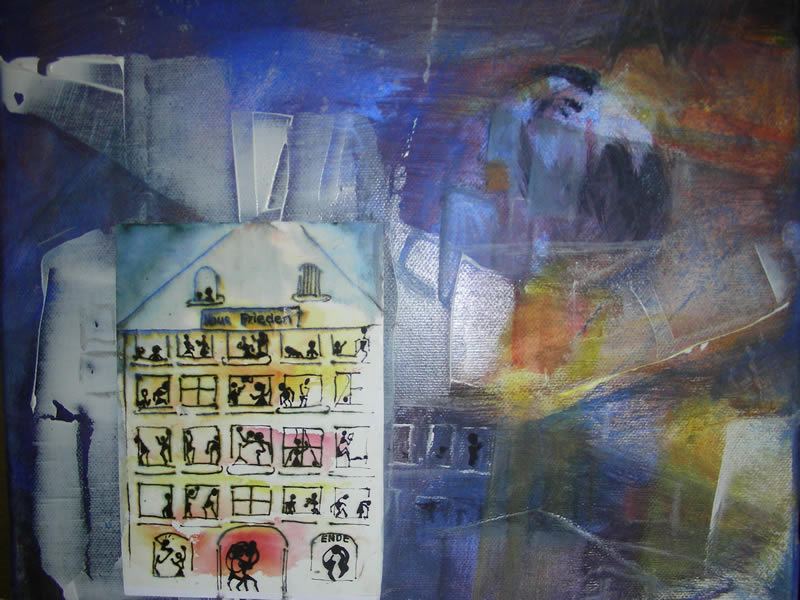 Neben Farbpigmenten, Sand, Asche und Strukturmaterialien sind meine "Collagen" auf den Leinwänden fast immer selbst gemalte Aquarelle, Skizzen oder Zeichnungen.